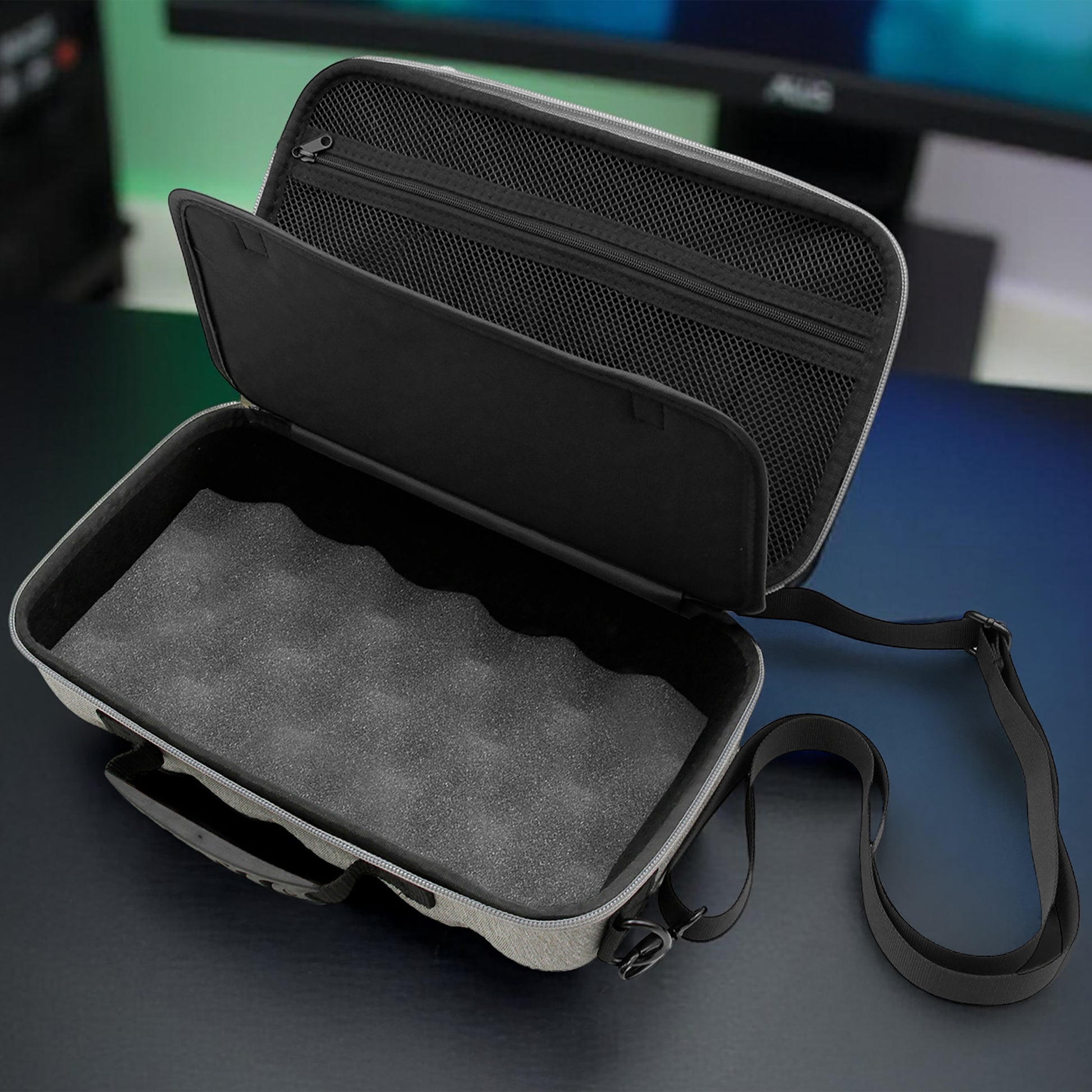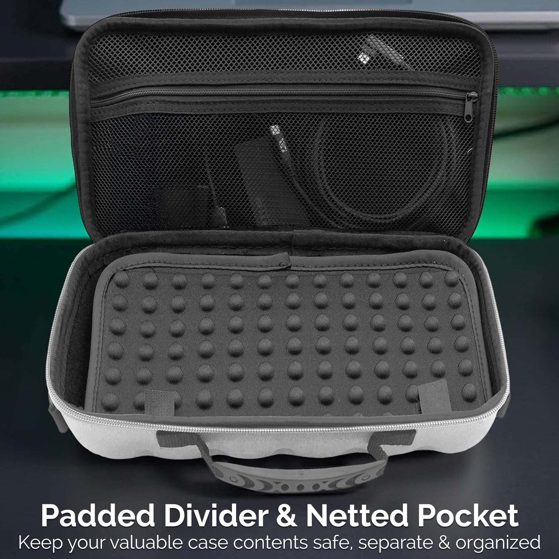 - Accessory Storage and Cable Management – A built-in padded divider and zippered mesh pocket hold chargers, adapters, and cables neatly in place while preventing contact with the console’s screen.