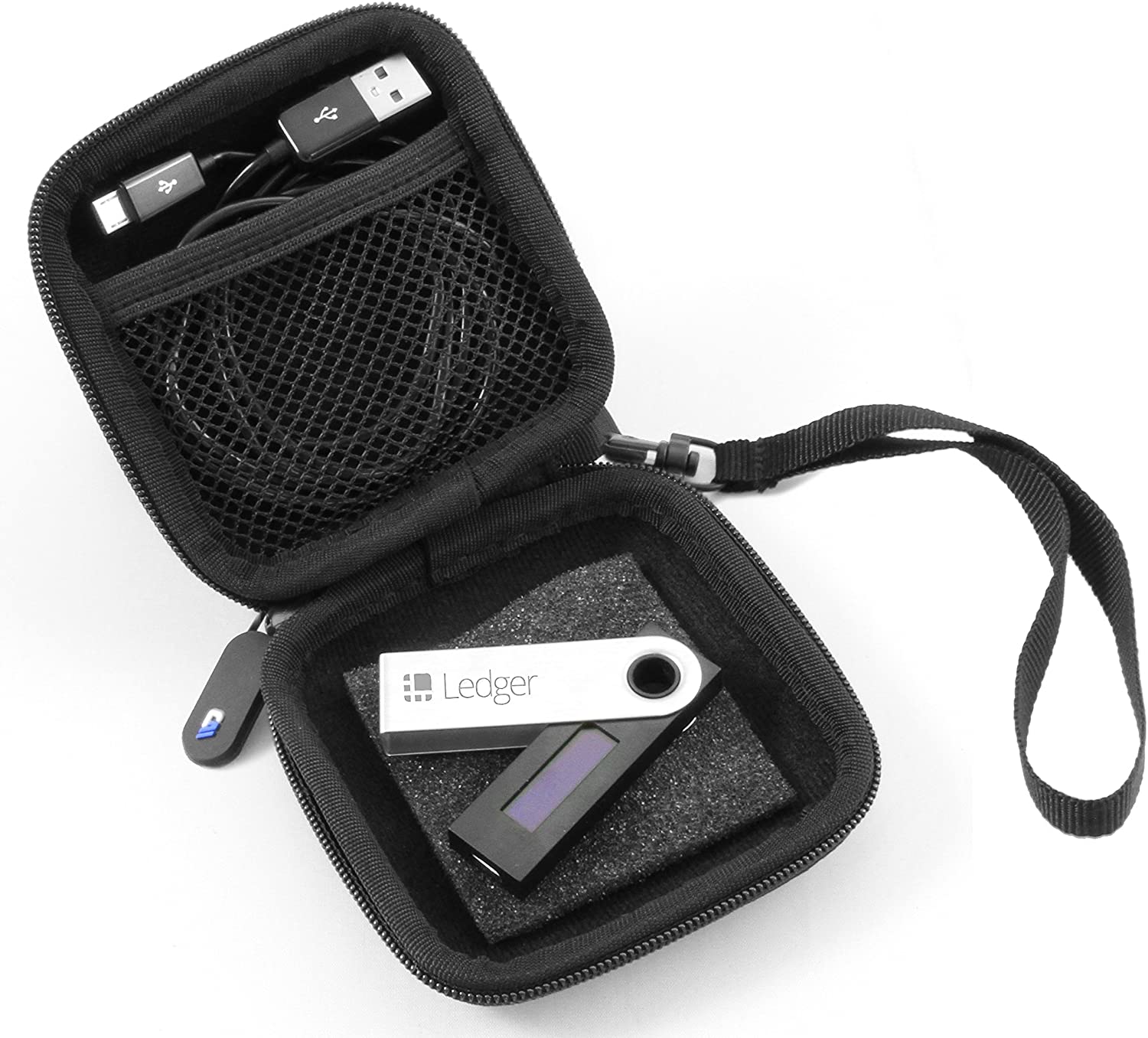 • Durable Carbon Fiber Pattern EVA: Provides protection from scratches and dust that can damage your portable crypto wallet. Interior has elastic netting to keep the Bitcoin wallet in place and cables can be stored in the center.