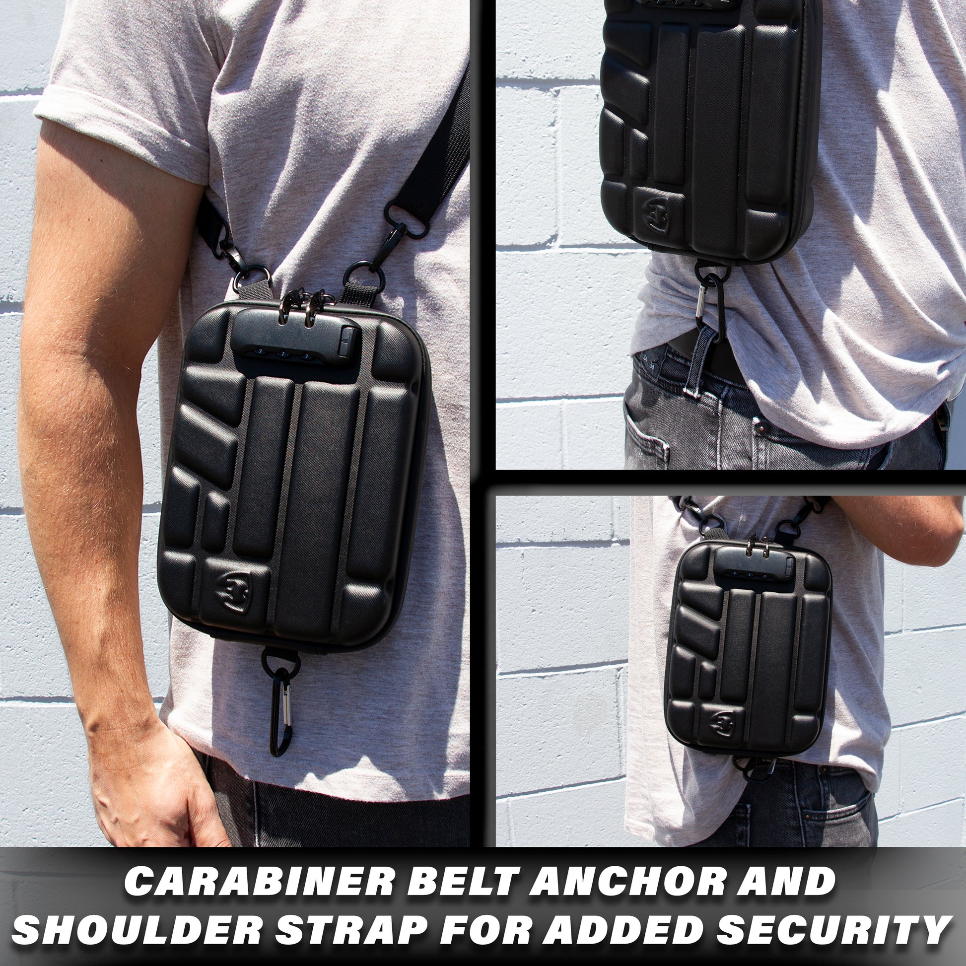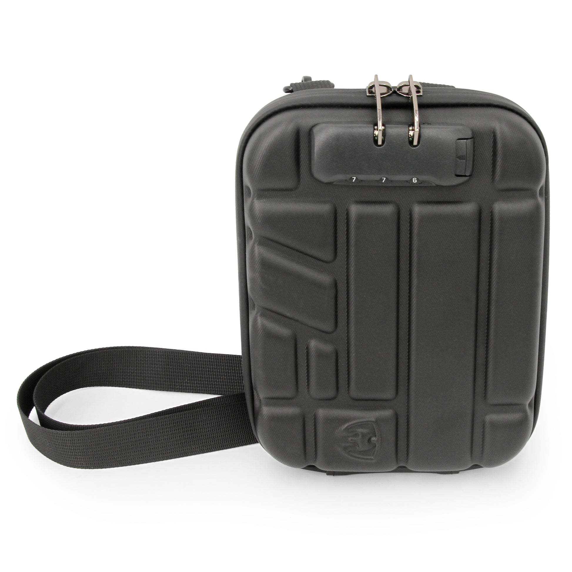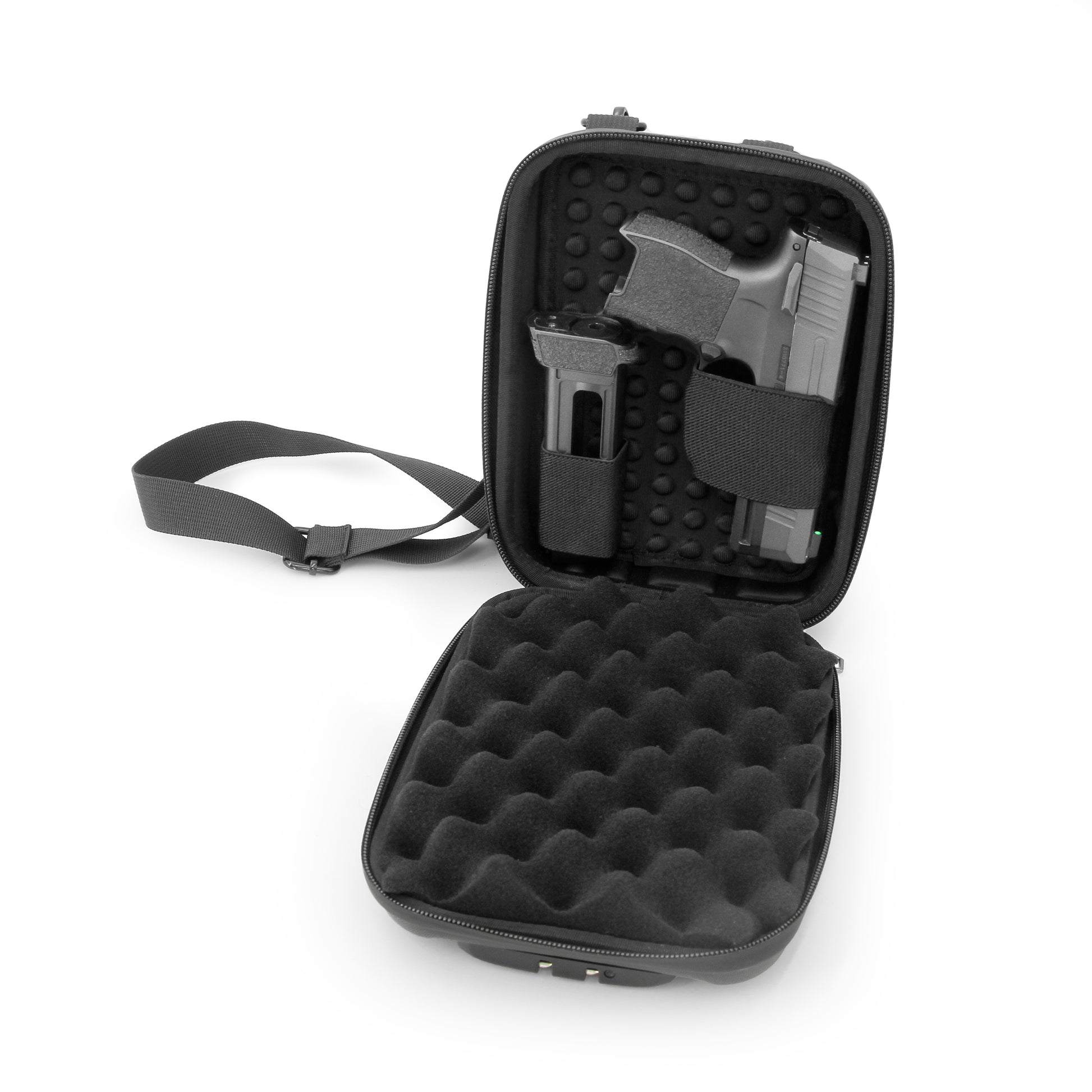 • CASEMATIX Premium EVA Locking Gun Case For Handguns: Features rugged construction with snap-in zippers, padded interior foam and built-in metal body anchor for extra security. Throw the strap over your shoulder and clip the bottom carabiner to your belt loop for secure body attachment during concealed carry transport.
