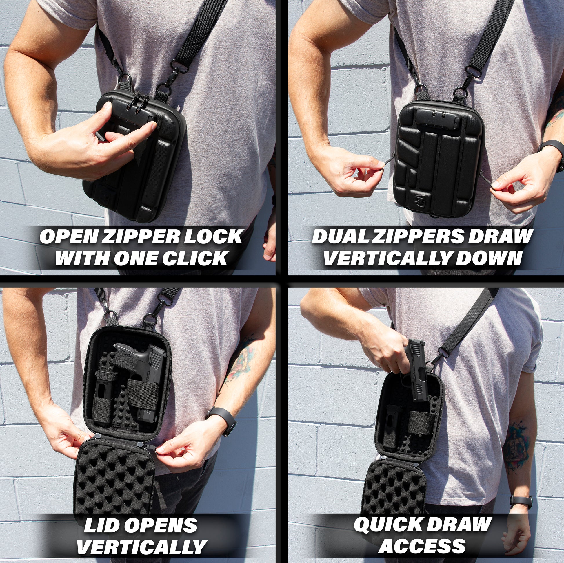 • Concealed Carry Gun Bag For Pistols 9mm: This gun case has been specifically designed to provide a new way to transport your favorite compact pistol with sleek shape that allows it to be securely fastened to your body or thrown inside larger handgun bags. Cross body shoulder strap and vertical opening zippers allow quick access to your firearm.