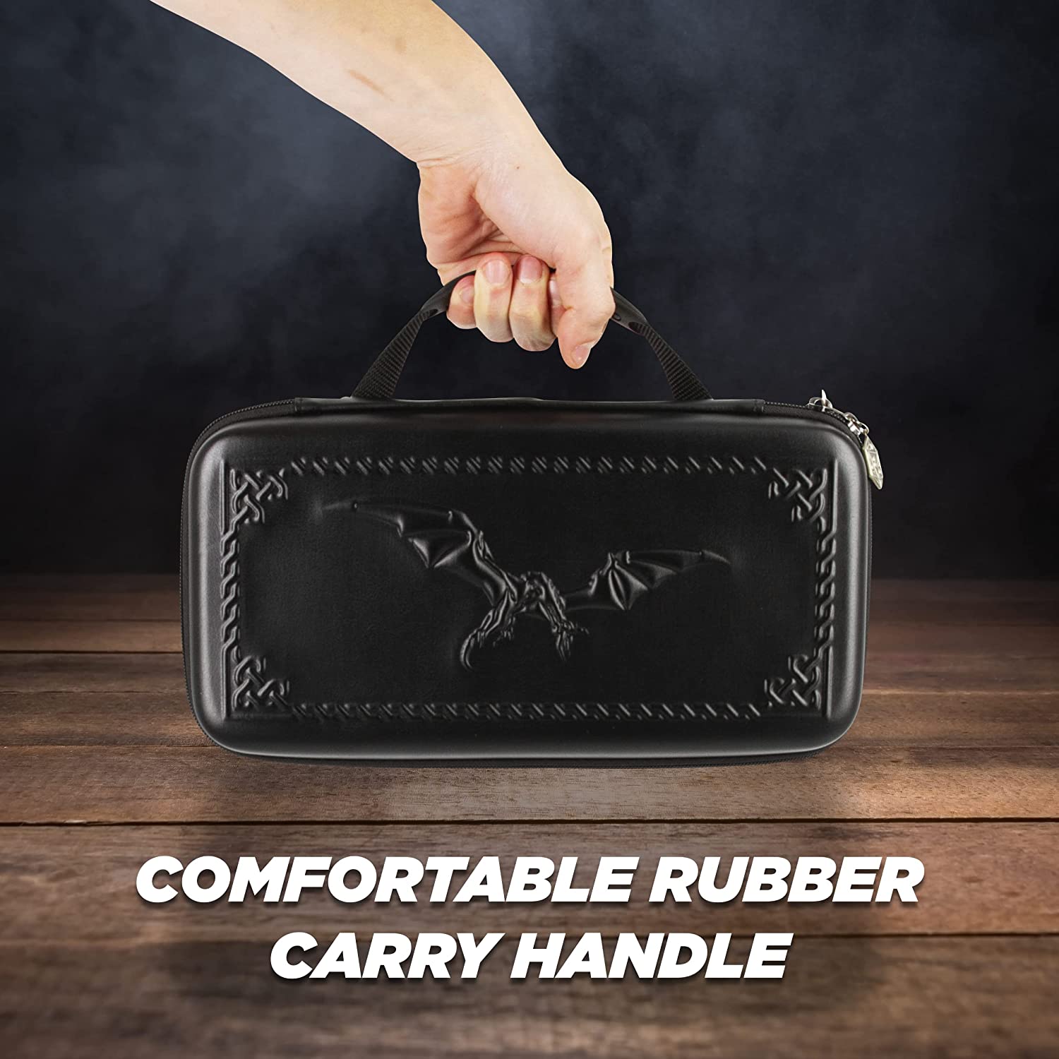 • Perfectly Portable Gaming Design: External dimensions of 12.75" x 6.5" x 3" with comfortable rubber handle making carrying this decorative dice box a breeze, allowing you to stow dice, cards, pencils, and accessories in convenient form-factor for tabletop gaming sessions.