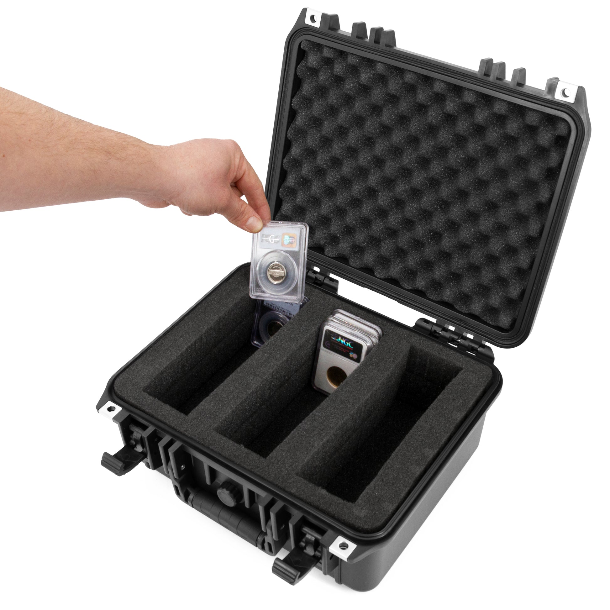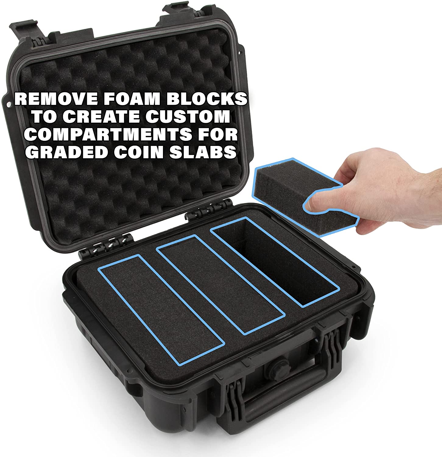 • Customizable Foam Interior: Fits 55+ graded coin slabs with impact-absorbing foam middle and soft foam lid/bottom that allows coins to fit vertically. Create separate coin holder slots to prevent scratches and movement, with maximum internal space of 11" x 7.5" x 4".