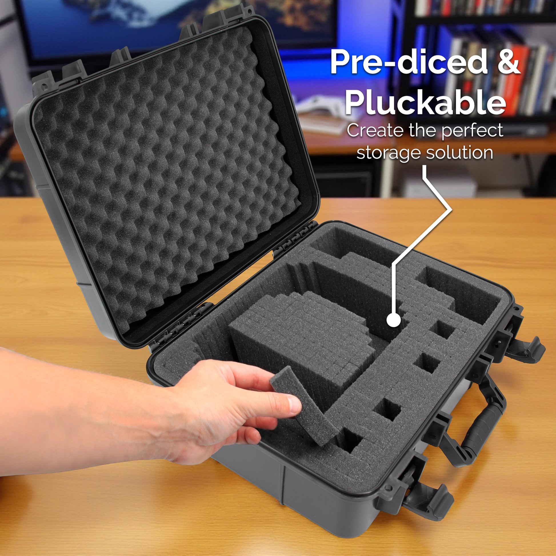 - [HARD SHELL EXTERIOR & SOFT DICED FOAM INTERIOR]: Create custom compartments for your virtual reality headset and accessories – Interior measures 14.5" x 10.5" x 4.5". & Exterior measures 16" x 13" x 6"