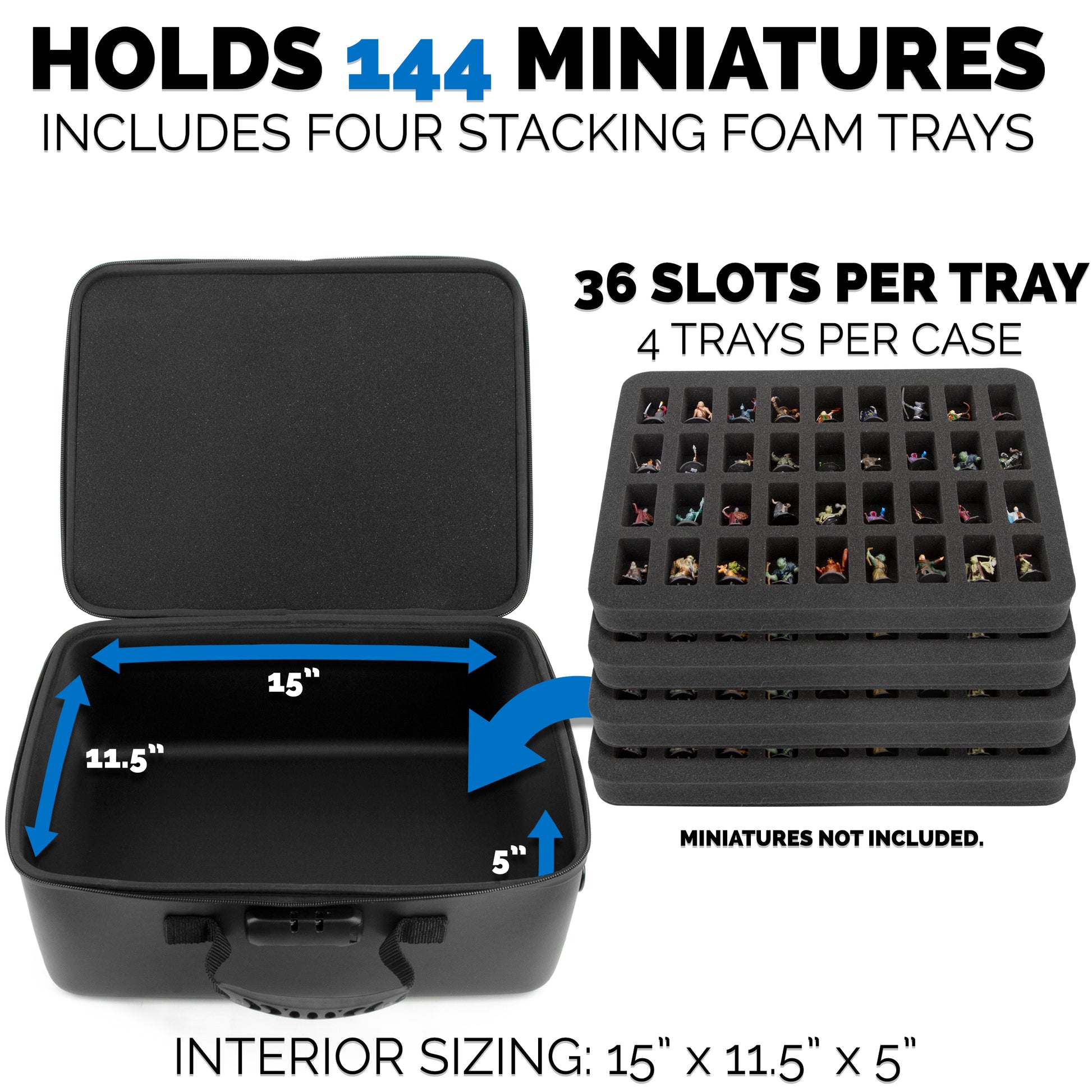 Miniature Carrying Case with Programmable Lock - 144 Slot Miniature Storage Case with Four Foam Trays For Minis, Shoulder Strap and More!