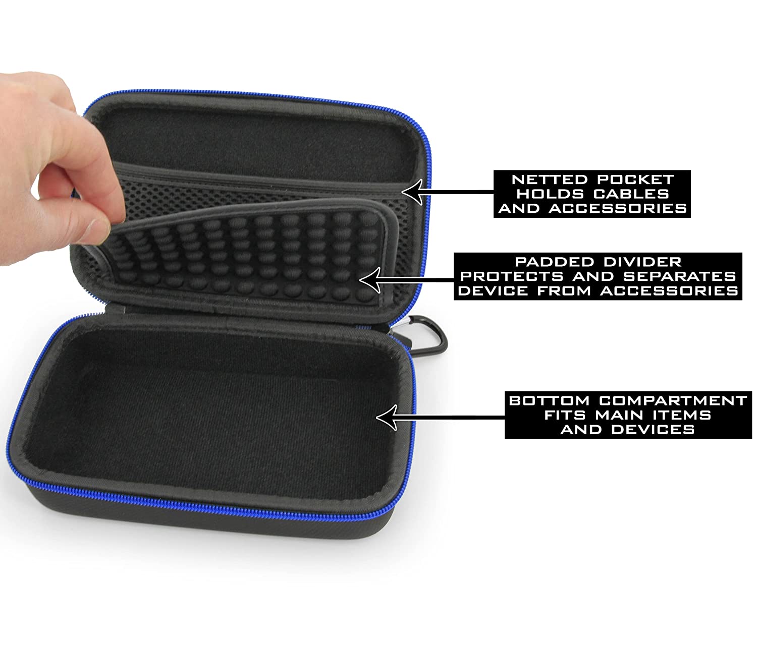 • Custom-Molded Interior Organization: Main compartment specifically shaped providing snug fit for handheld gaming controllers measuring 6.75" x 3.75" x 1.5" with divider separating lid and 0.5" accessory compartment above, plus netted accessory pouch for cables and adapters.