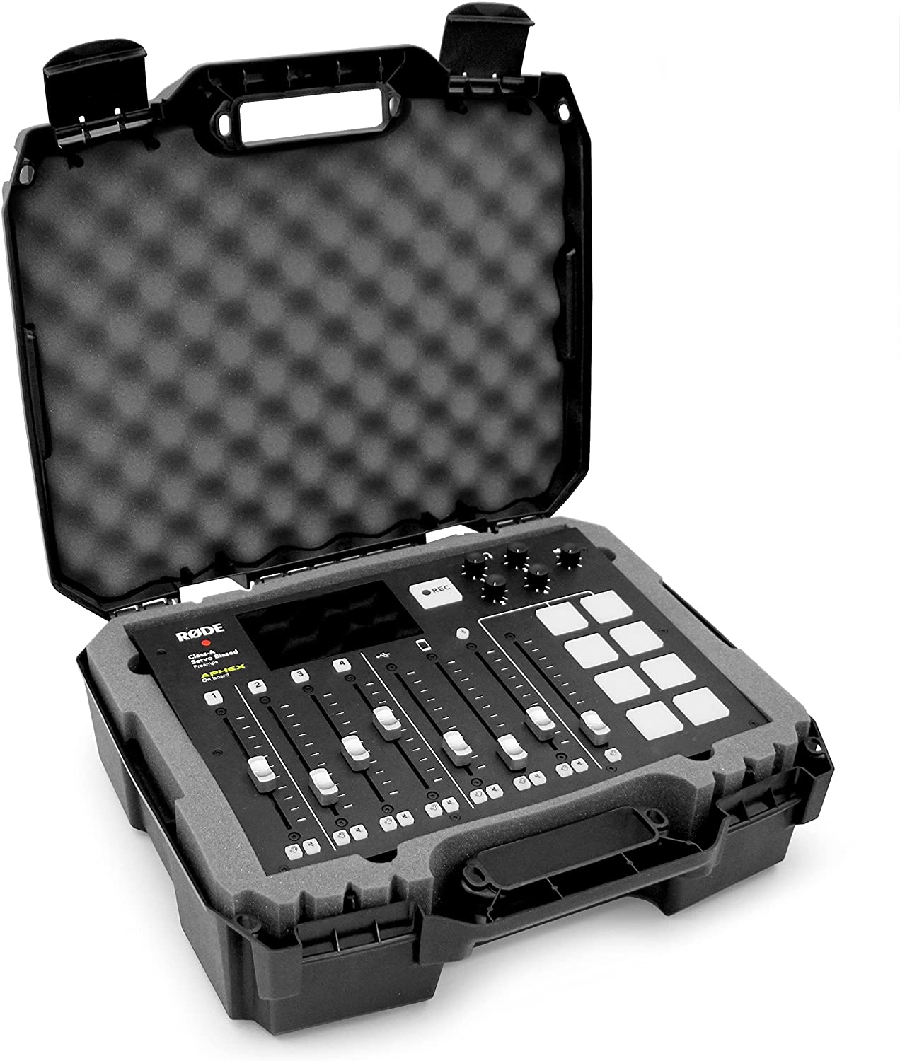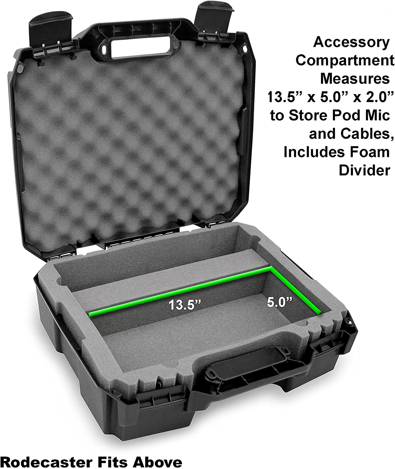 • RodeCaster Pro Podcast Equipment Protection: Crushproof 17" impact-resistant mixer audio case compatible with podcast mixer and podcast kit accessories, protecting your valuable podcaster, microphones, and audio mixer with ultra-durable hard polymer composite plastic exterior construction.• Precision-Cut Impact-Absorbing Interior: Dense impact-absorbing protective foam precision-cut for podcast production studio mixers with thick egg-crate foam top and pre-cut layer perfectly fitting your recording interface, microphone, and accessories - even knobs and buttons are protected.• Custom Foam Compartment System: Custom foam compartments snugly holding your device in place surrounded by dense padding on all sides, with bottom accessory compartment measuring 13.5" x 5" x 2" for mic and cables with included divider for complete organization.• Travel-Optimized Professional Design: External dimensions of 16" x 13" x 6" with comfortable carry handle creating perfect solution for conveniently carrying your podcast audio mixer equipment and accessories, featuring briefcase-style design ideal for travel.• Made in USA Premium Construction: Includes warranty against defects with dual quick-snap latches securely closing case, two optional padlock holes, reinforced design protecting from dust, drops, and scratches, plus smooth opening long-lasting hinges for lifetime durability.