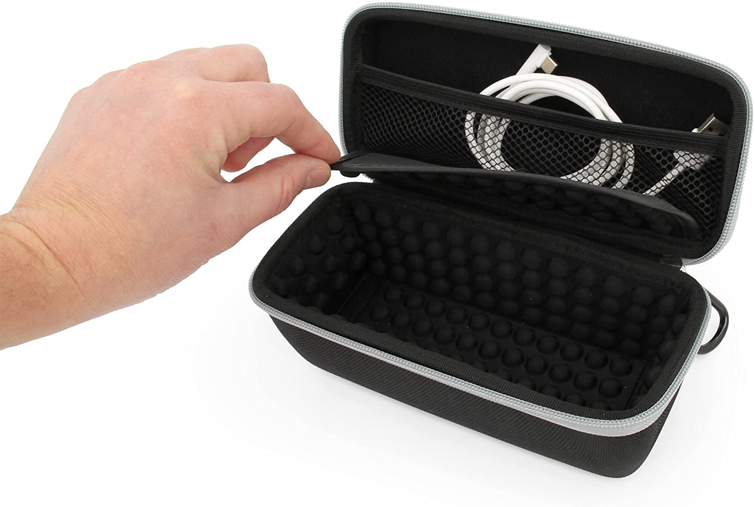 • Organized Accessory Storage: Lid features 0.75" deep built-in netted pocket holding charger and cable, with protective middle divider separating accessories from speaker and keeping everything snugly held in place for complete system organization.