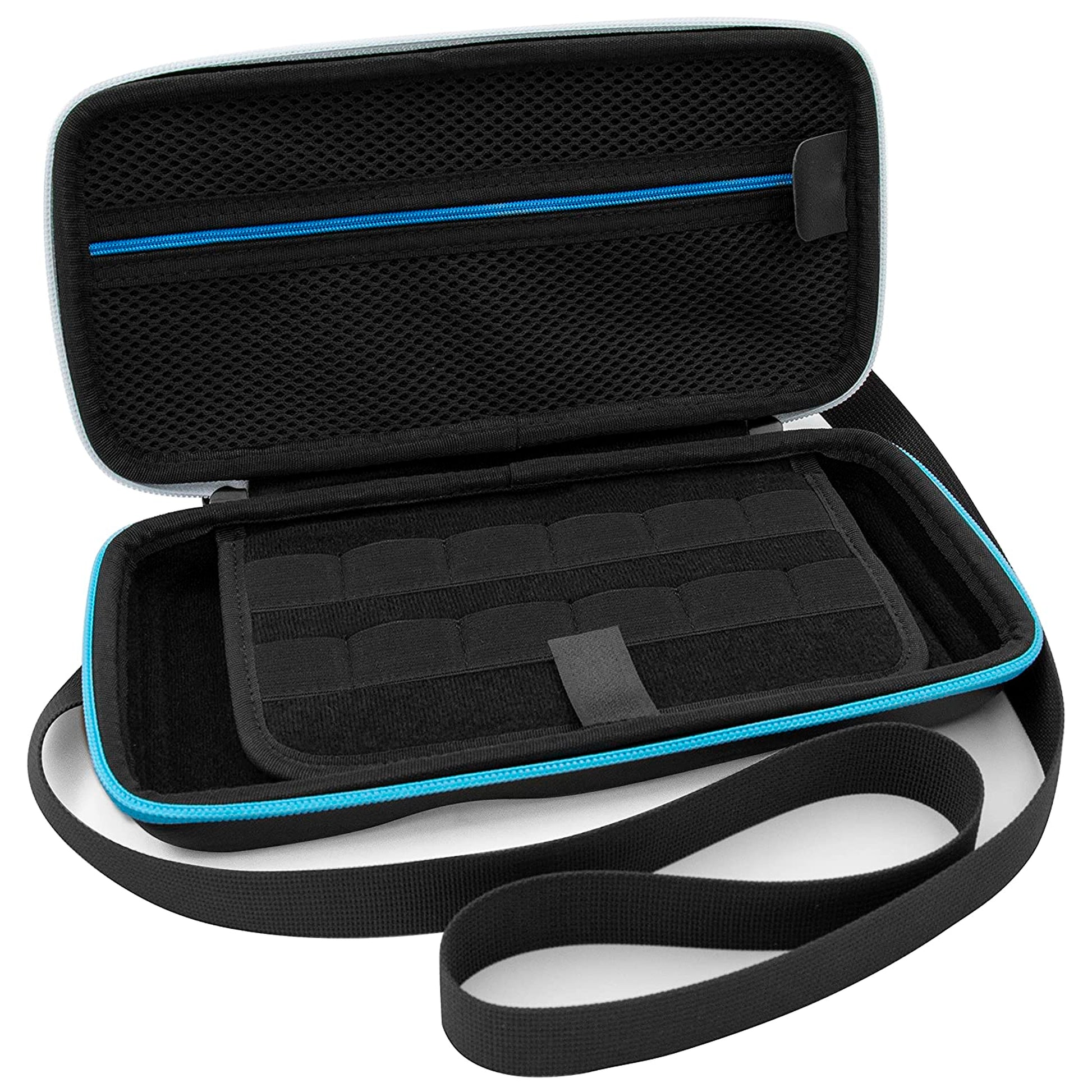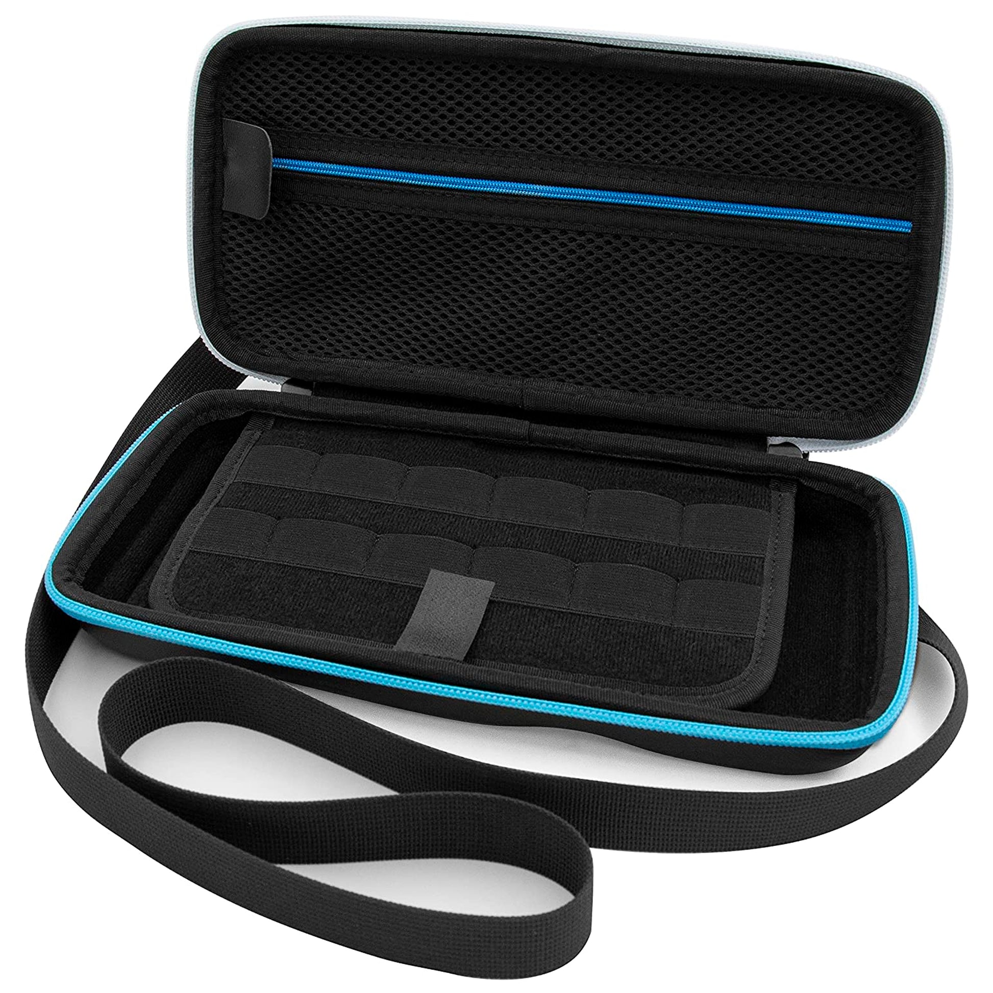 • Perfect Travel Companion: Comfortable travel handle and adjustable shoulder strap with compact 10.5" x 5.5" x 3" external dimensions slip easily into backpacks for portable gaming on the go