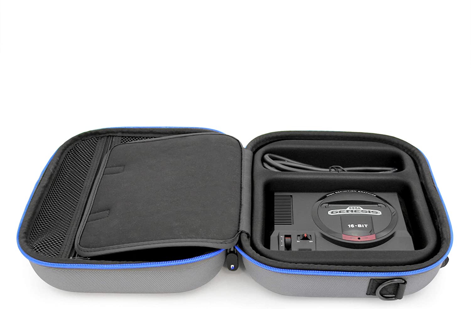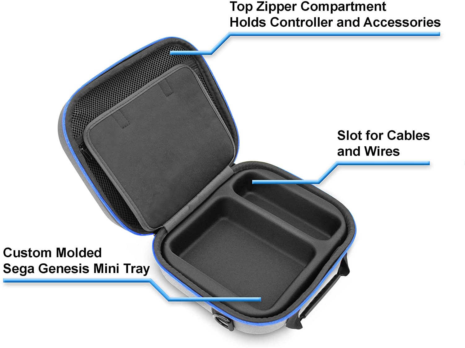• Keep the Sega Genesis Mini and Accessories Organized: When traveling. Bottom video game compartment has a molded cutout for the Sega and separate compartment for cables. A padded velcro divider keeps it held in place securely.