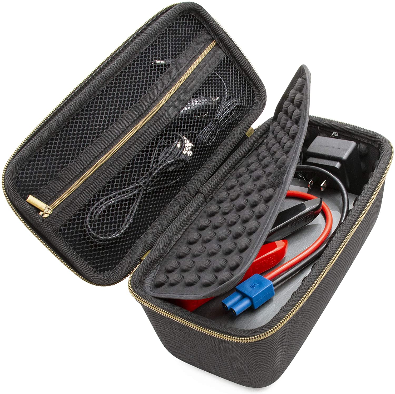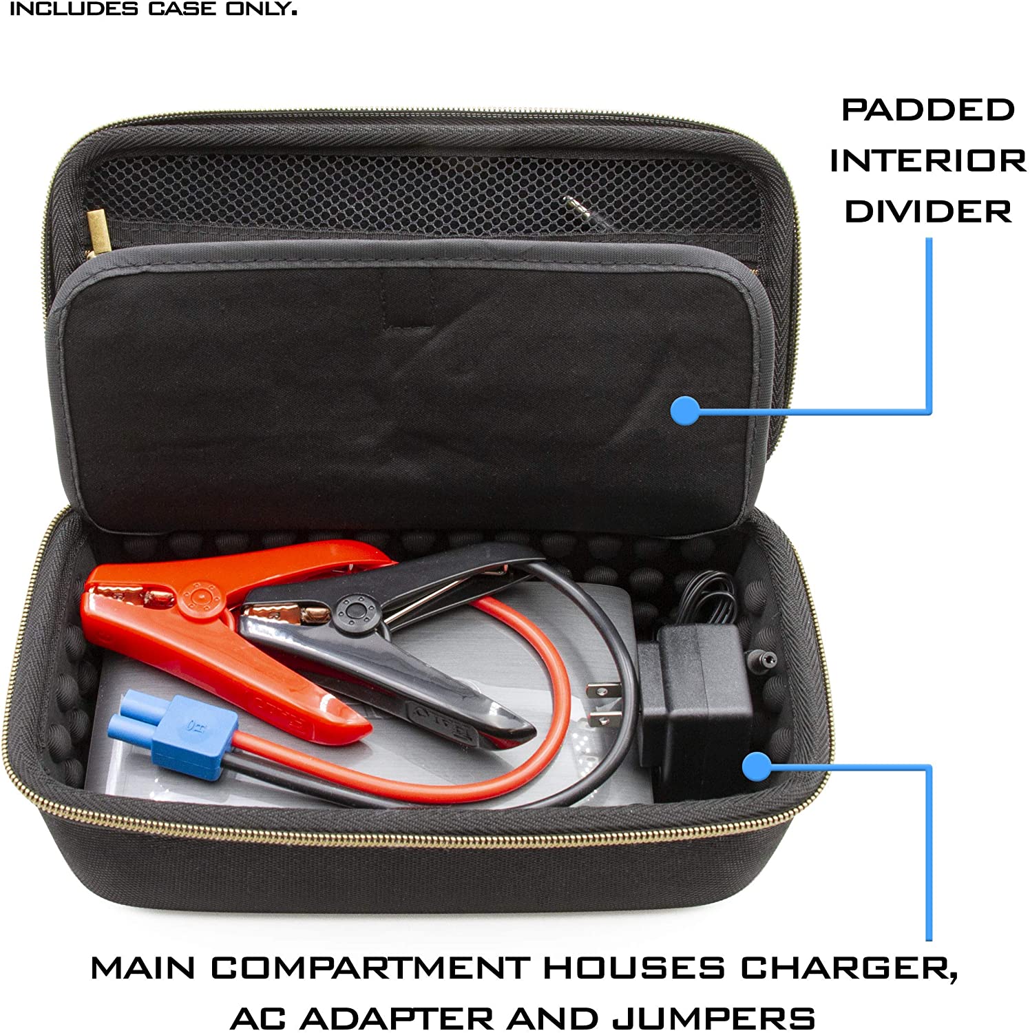 • Organized Dual-Compartment Storage: Padded divider separates battery pack and jumper cables in the main compartment from smaller accessories like car chargers and USB cables in the zippered pouch
