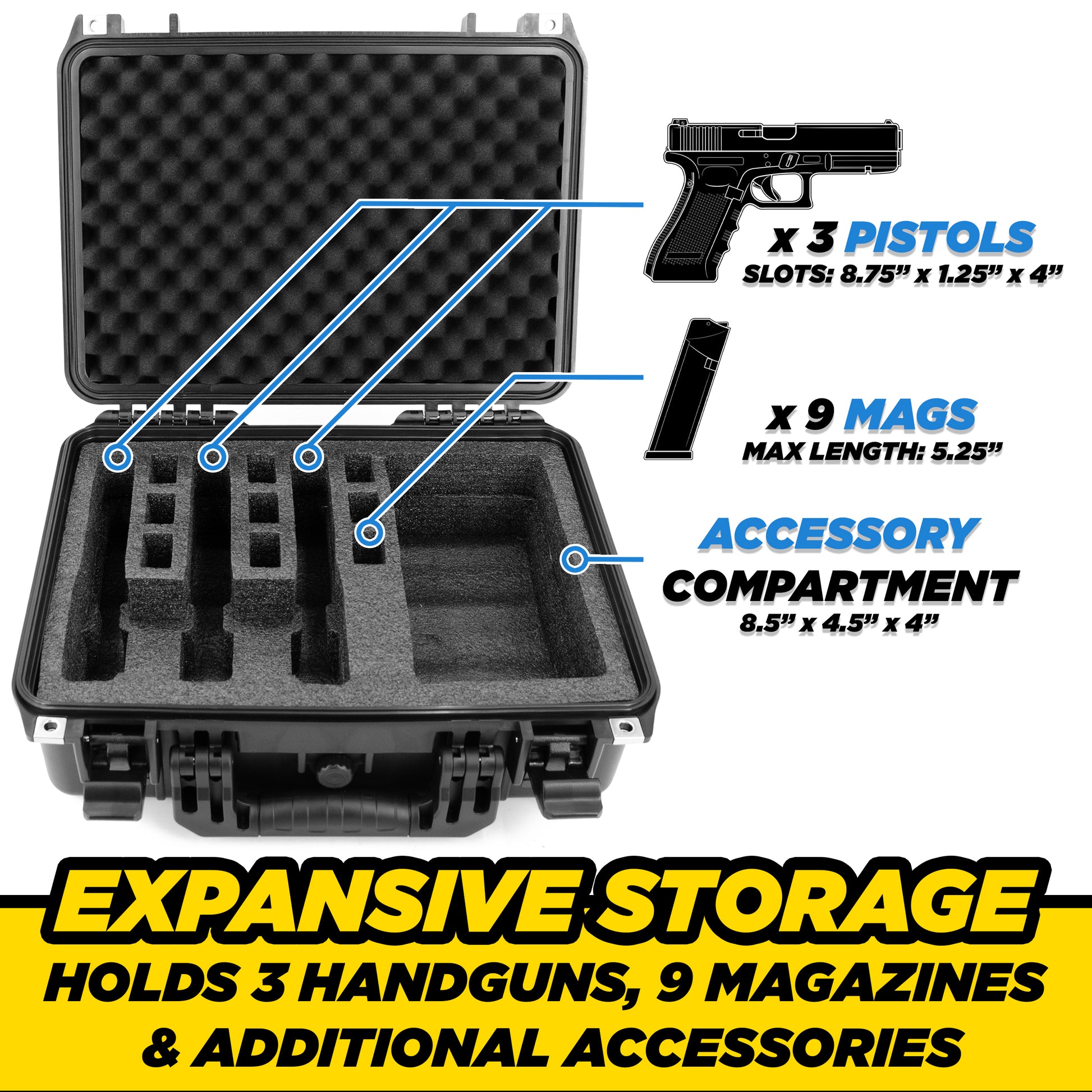 • Complete 3-Pistol Storage System: Pre-cut foam with 3 pistol slots (8.75" x 1.25" x 4") accommodates handguns plus 9 dedicated magazine slots for standard 9mm magazines up to 5.25" length, creating a comprehensive firearm storage solution for serious shooters.