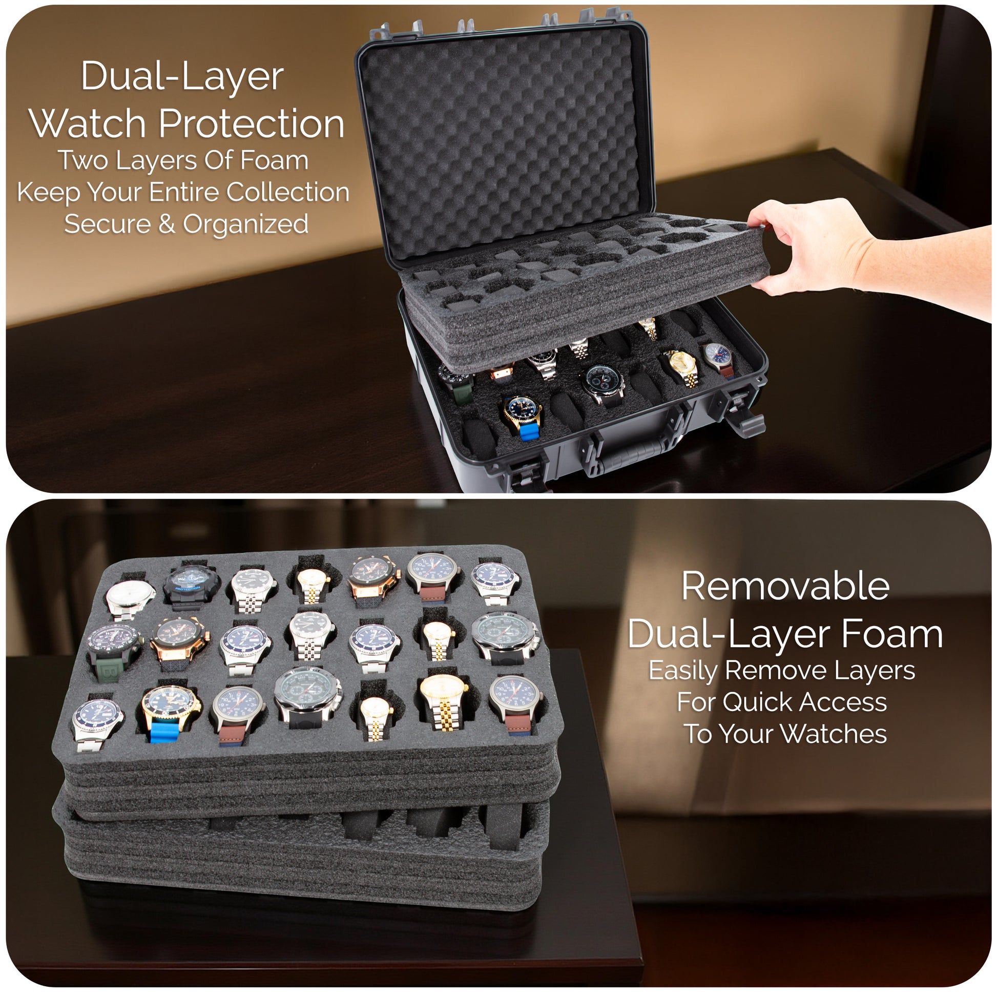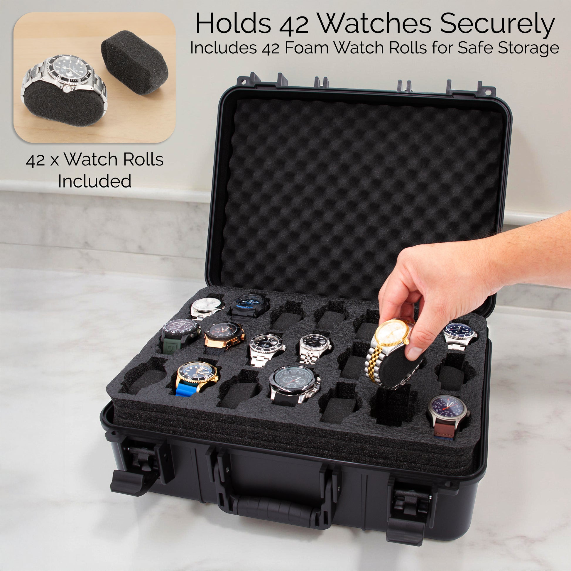 - Impact-Resistant Travel Watch Case: Every aspect of this case has been designed to protect, store and display your valuable watch collection. Constructed from durable plastic with shock absorbing interior to prevent scratches on watch bands and faces