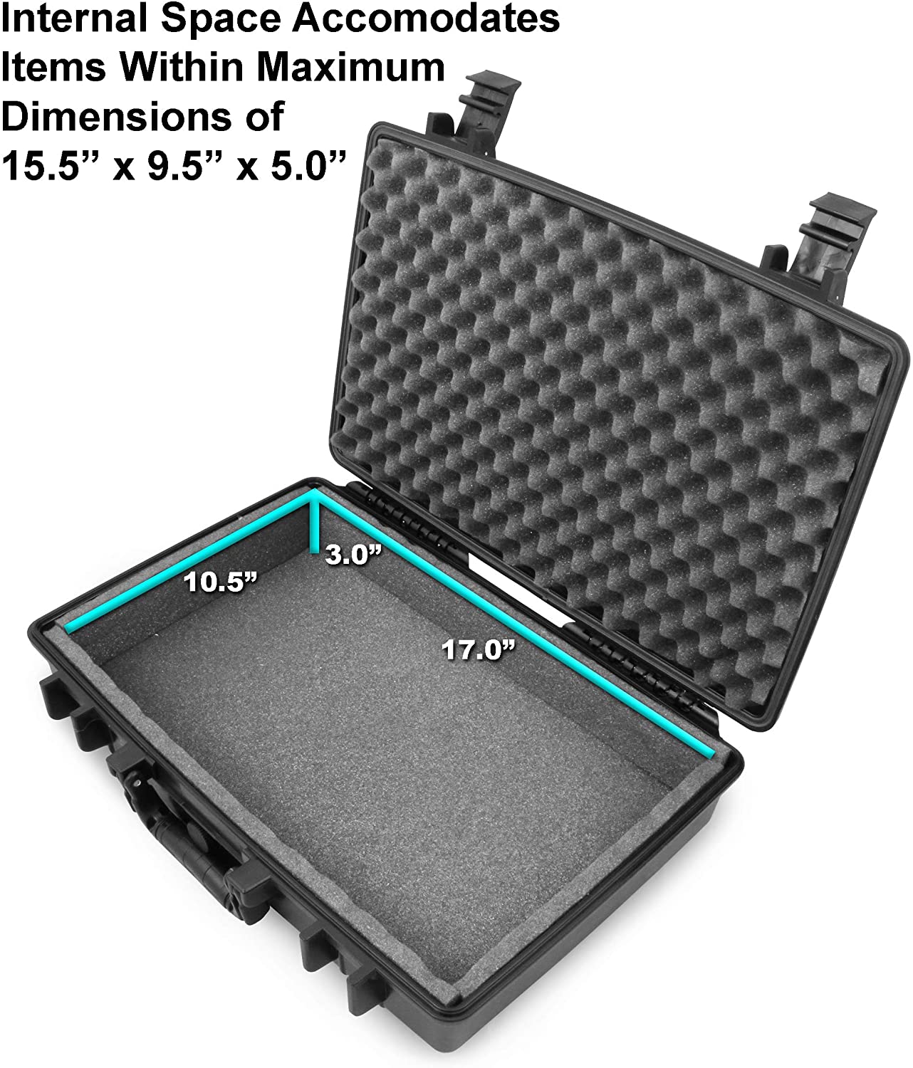 • Gaming Laptop Interior System: Gaming Laptop Case with internal foam 15.6" compartment having maximum usable space of 17" x 10.5" x 3" with two 0.25" included flat foam pieces creating snug fit or divider for accessories such as adapters, featuring thick egg-crate foam top and separate flat foam middle layers for adjustable depth protection.