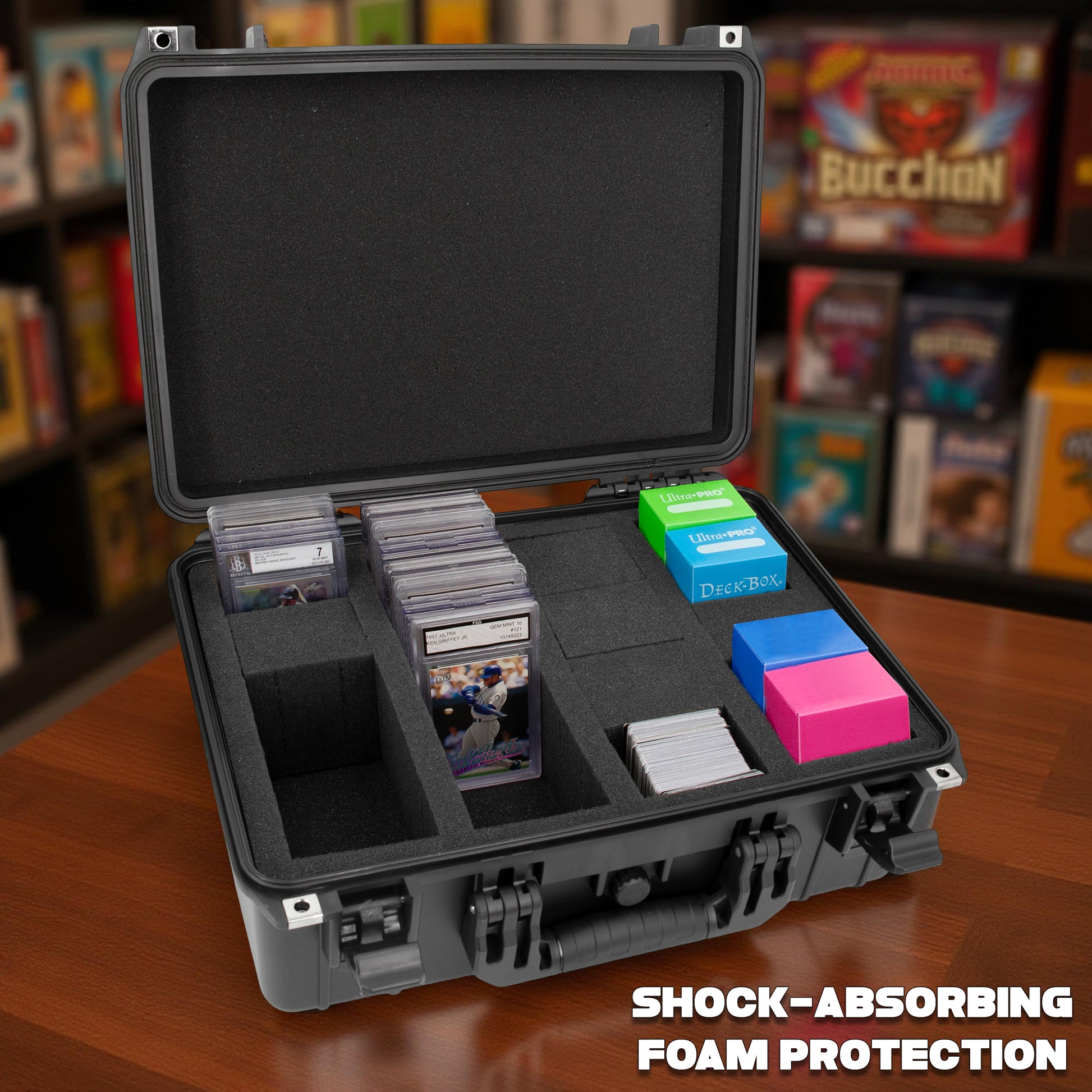 • Prevents Scratches, Rubbing, Scuffs: Four interior foam slots measuring 10" x 5.5" x 3.2" each - each slot contains four removable graded sports cards holder foam blocks creating snug fit and separating cards